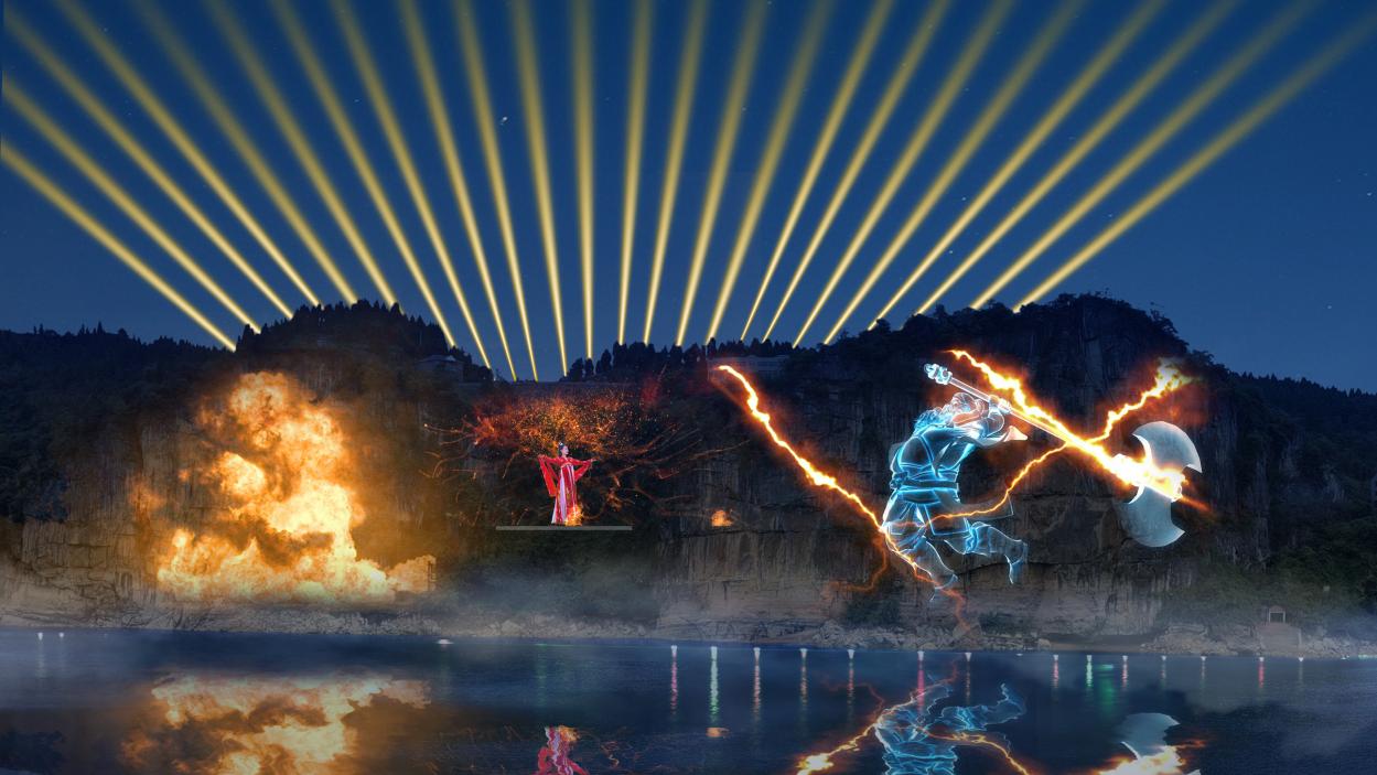 游船入口,穿过白沙大桥桥洞,水帘上出现神兽迎宾,带领游客进入上古原始部落世界。
